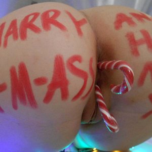 Голая девушка с надписью на жопе и леденцом в вагине ждёт Новый год (12 фото)