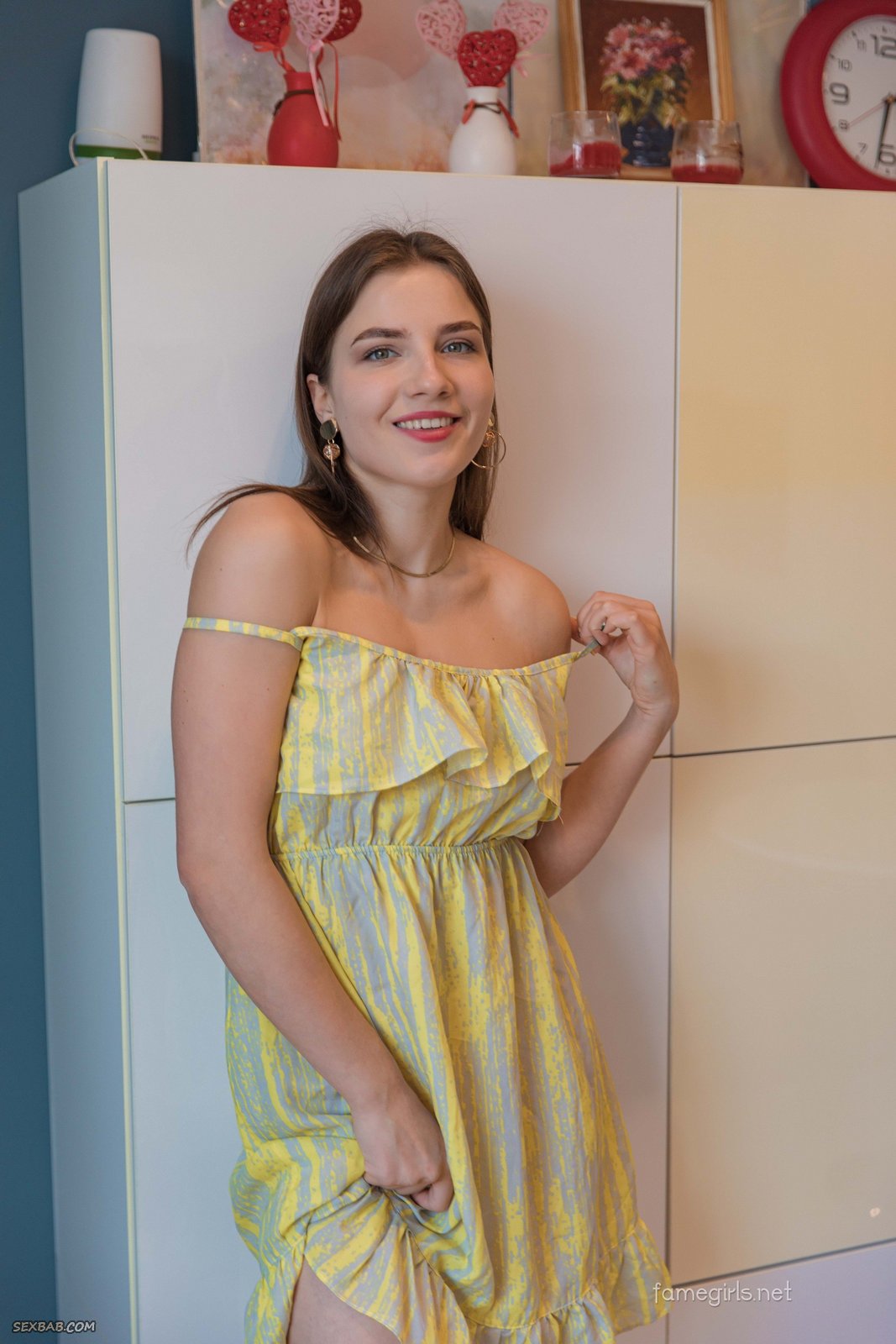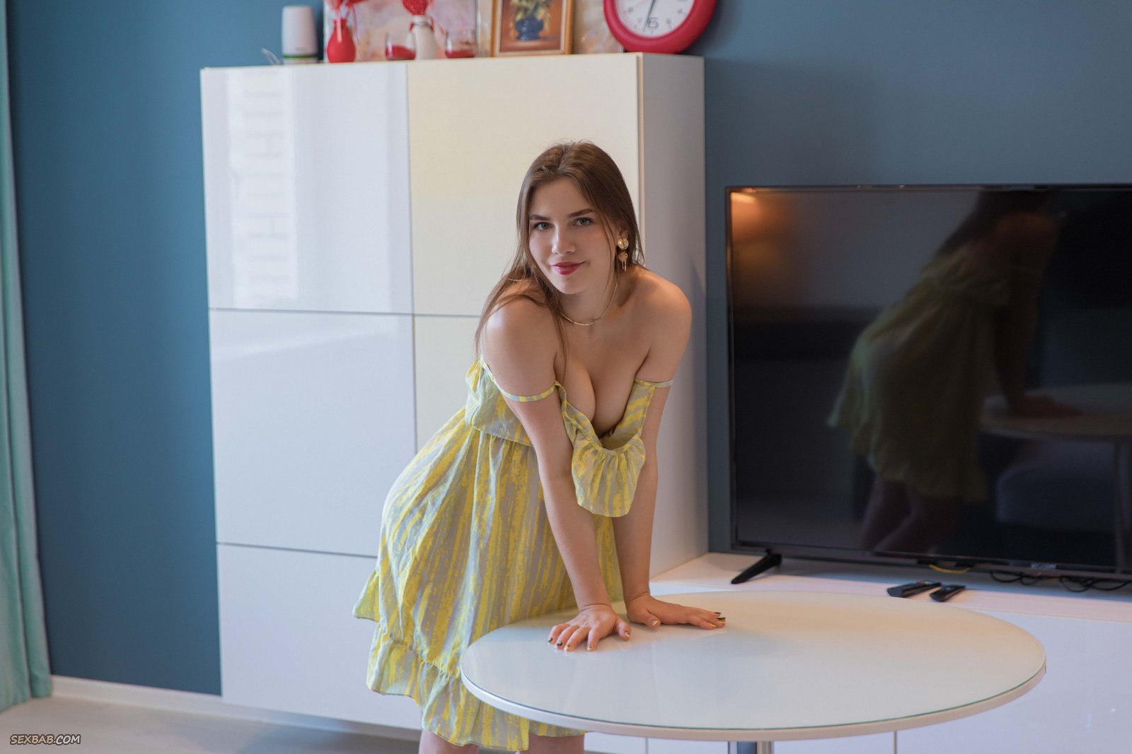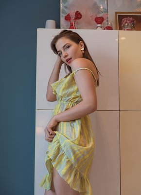 Описание: Кокетливо играясь с коротким легким платьишком и постепенно оголяя свое тело перед камерой, молодая голая простушка с маленькой грудью расслабленно развалилась на диване с широко раздвинутыми ногами и с удовольствием показала нам свою бритую сладкую пизду, буквально напрашиваясь на горячий страстный секс.