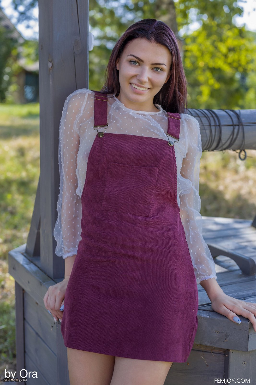 Описание: Кокетливо задрав свой короткий сарафанчик, деревенская девица без трусов охотно показала на камеру свою бритую сочную письку. Постепенно раздевшись до гола и забравшись на колодец, бесстыжая девка с маленькими титьками в разных откровенных позах начала предлагать себя любому желающему, желая поскорей заняться жарким сексом.
