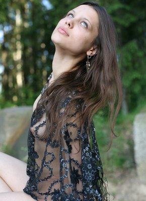 Описание: Где-то глубоко в лесу на фоне природы молодая красавица с потрясающими глазами эротично позирует полностью обнаженной перед камерой. Изящная девушка не стесняется своего вида и с удовольствием соблазнительно изгибается всем телом на большом камне, показывая нам свои маленькие грудки и пушистую киску.