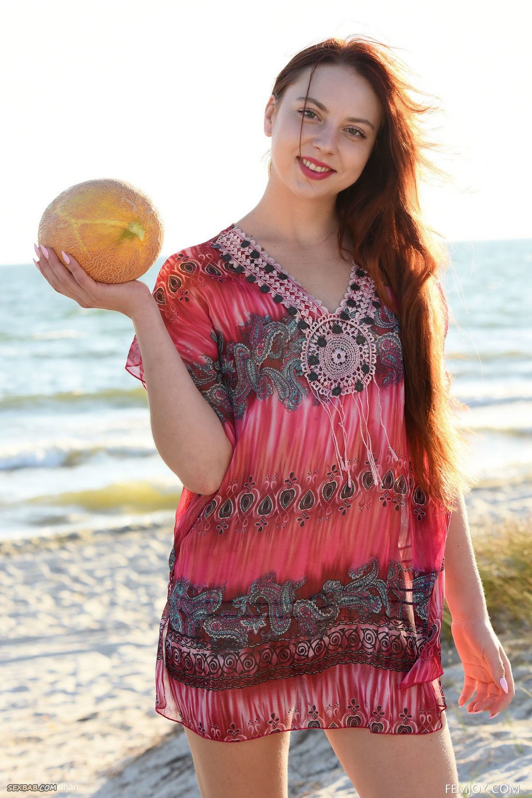 Описание: Аппетитная рыжая тётка в легкой накидке без белья эротично разделась до гола на пляже и принялась возбуждающе есть перед камерой сочную сладкую дыню. Голая баба с маленькими титьками расслабленно лежит на горячем песке и развратно раздвигает свои ноги в разных позах, засвечивая бритую пизду с большими половыми губами.