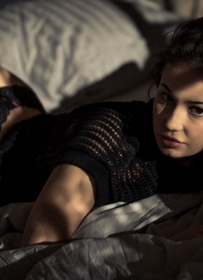 Описание: Соблазнительно медленно сняв кружевное черное белье, сексуальная голая девушка красиво позирует в постели перед камерой. Молодая брюнетка с натуральными мягкими сиськами расслабленно изгибается в разных позах, чувственно потираясь своей нежной чувствительной кожей о прохладные простыни.