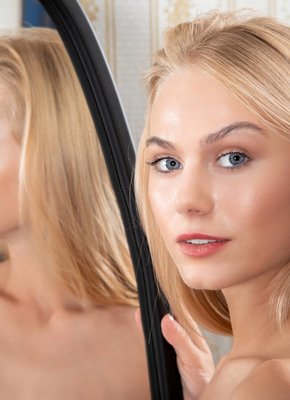 Описание: Красивая молодая блондинка эротично снимает с себя прозрачное нижнее белье и чувственно мастурбирует перед большим зеркалом. Обнаженная девушка с голыми аккуратными сиськами страстно извивается на полу от наслаждения и сильно трет свою нежную гладкую киску шаловливыми пальчиками.