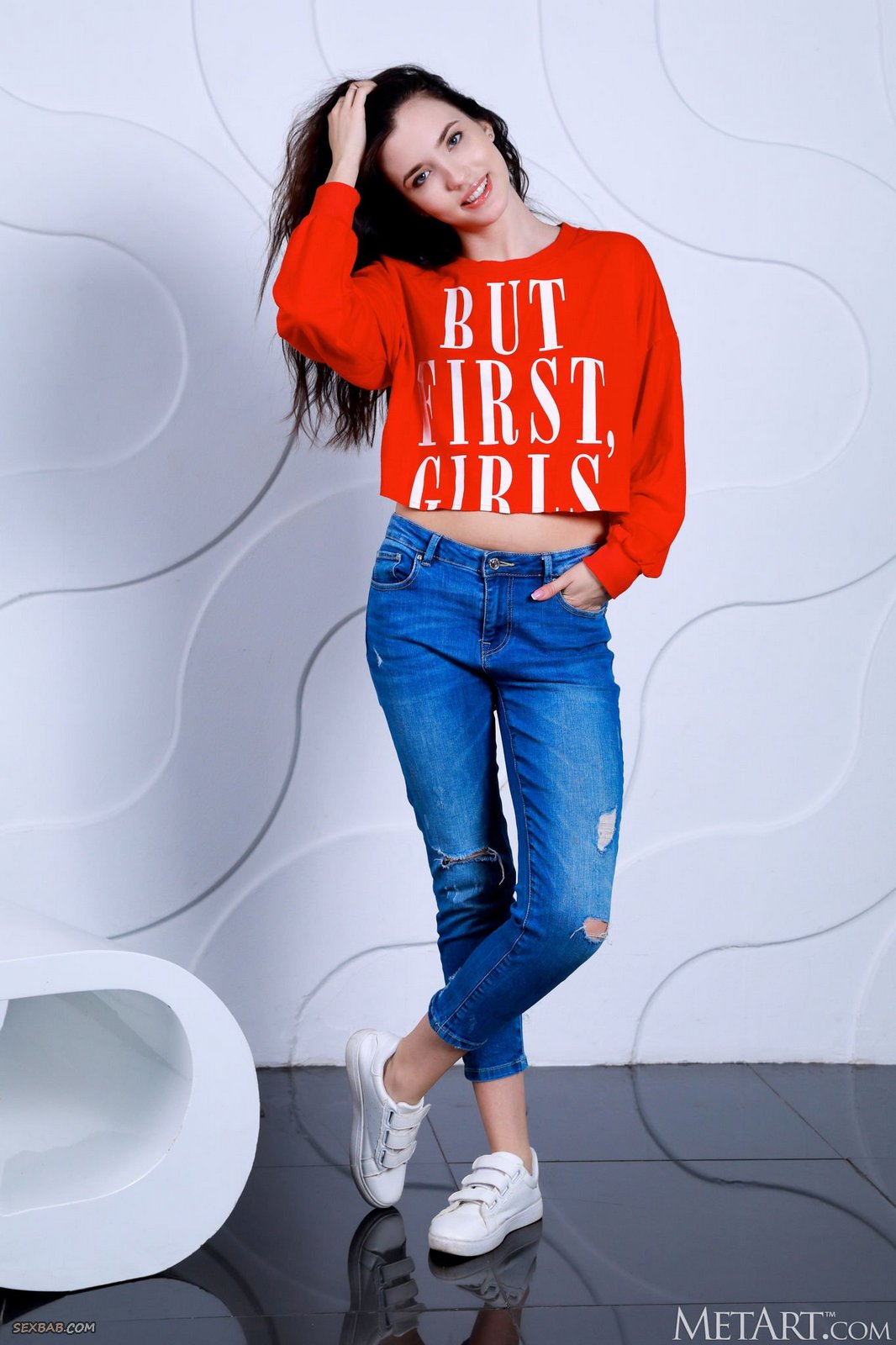 Описание: Игриво задрав кофту без лифчика, веселая молодая брюнетка с красивыми упругими сиськами медленно сняла джинсы, оказавшись абсолютно голой перед камерой. Стройная детка с изящным гибким телом без стеснения раздвигает свои ноги и крупным планом показывает бритую промежность с нежной розовой писькой.