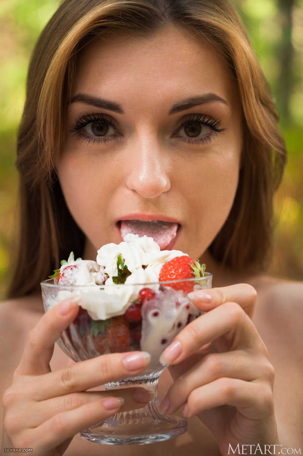 Описание: Страстно сорвав с себя всю одежду, развратная сексуальная телка вовсю развлекается в лесу, обустроив себе уютное местечко. Возбужденная девица с маленькими сиськами возбуждающе ест клубнику со сливками, а затем раздвигает свои стройные ножки и начинает ласкать свою бритую сочную письку пальчиками.
