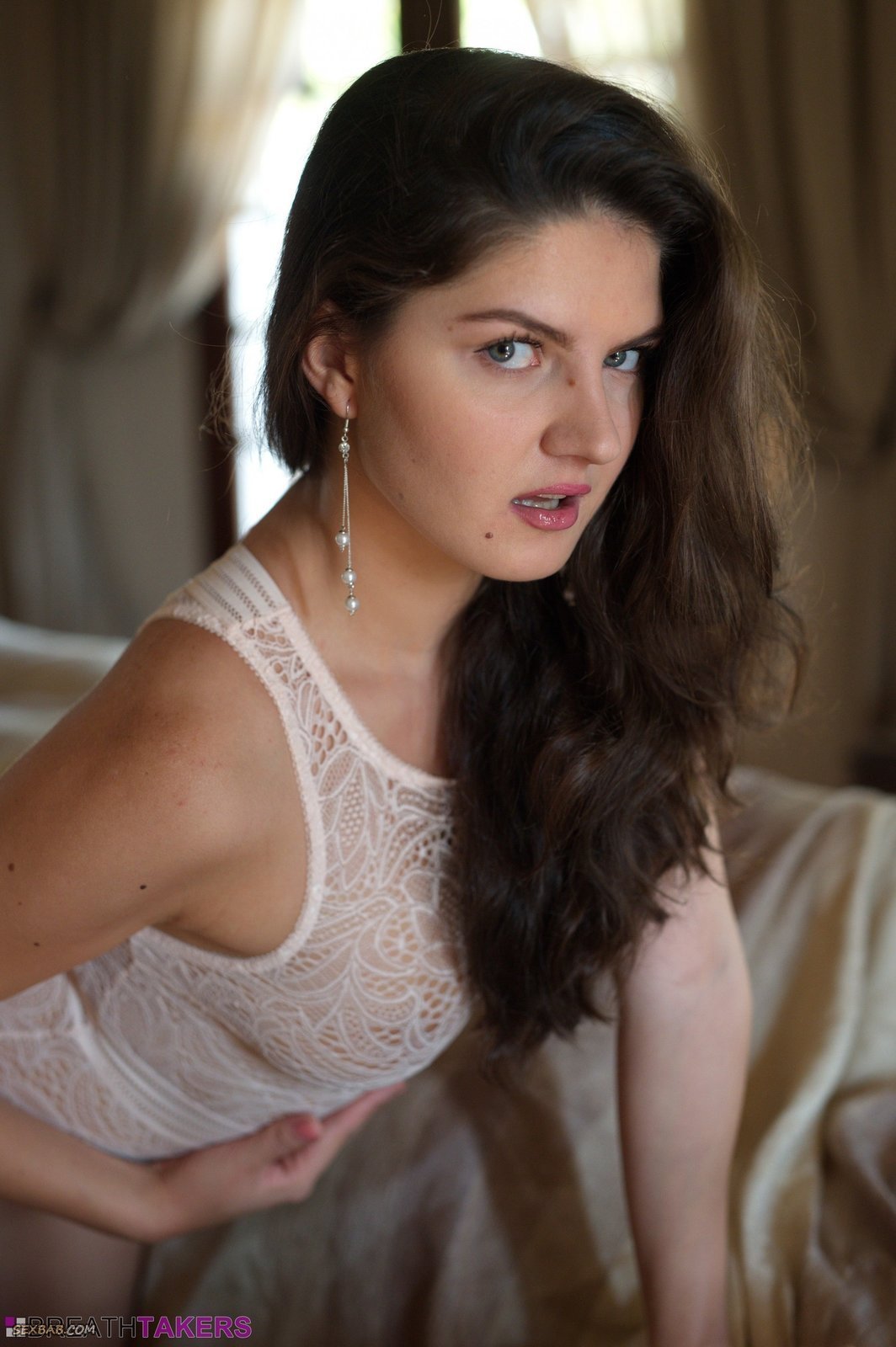 Описание: Обворожительная и достаточно сексуальная девушка, устроившись на диване, стоя на коленках, начинает возбуждающе открывать ротик и медленно раздеваться. В будущем она все же оголяется и подробно демонстрирует натуральные висячие сиськи и бритую письку, параллельно грациозно поднимая руки вверх.