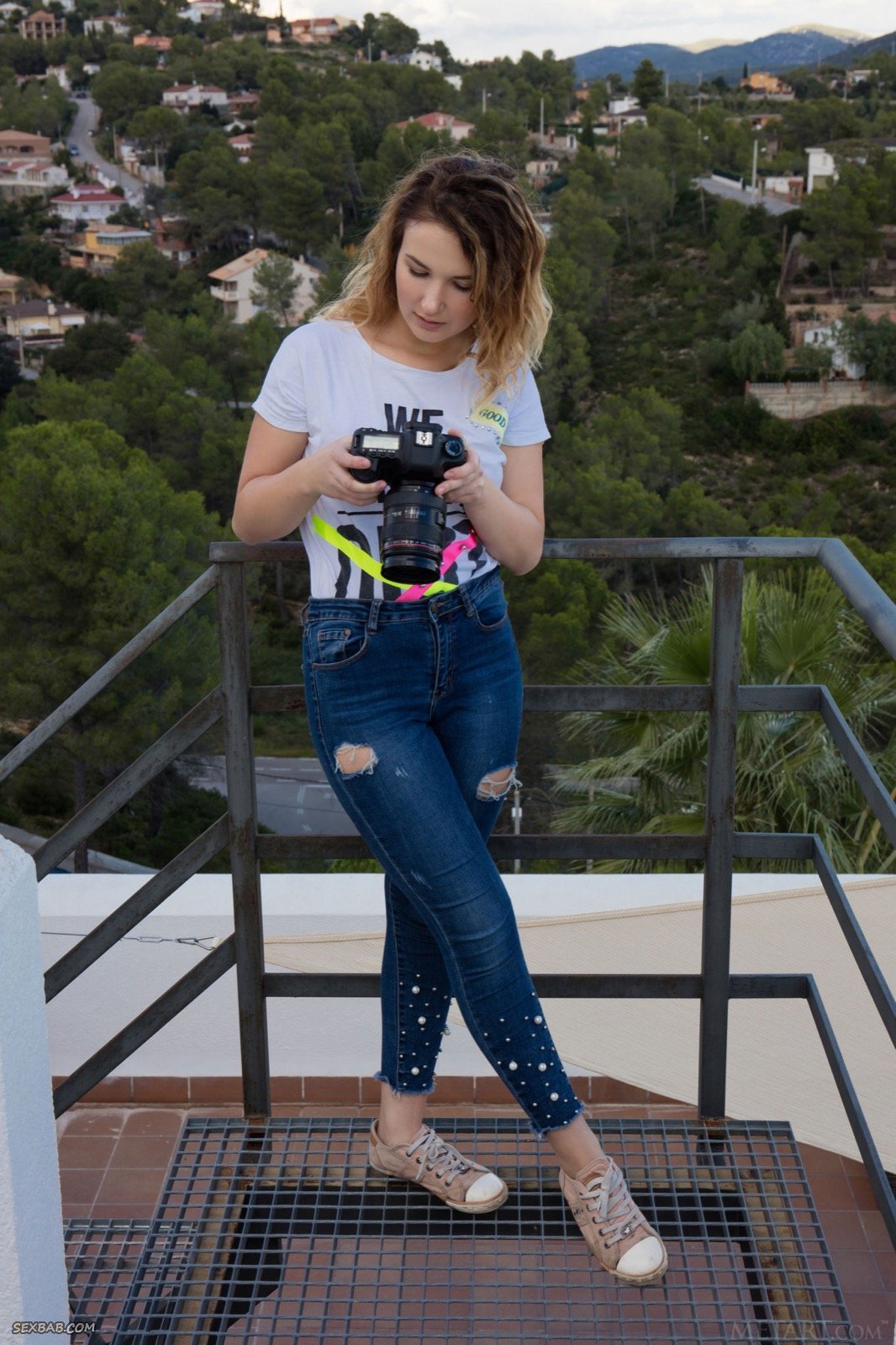 Описание: Сделав несколько фотографий на крыше, привлекательная девушка в дальнейшем решила раздеваться до гола, а сняв джинсы с футболкой, она продемонстрировала большую попку. Наслаждаясь, молодая красотка с маленькой заведенной грудью так же показывала крупным планом бритую письку с гладким лобком.