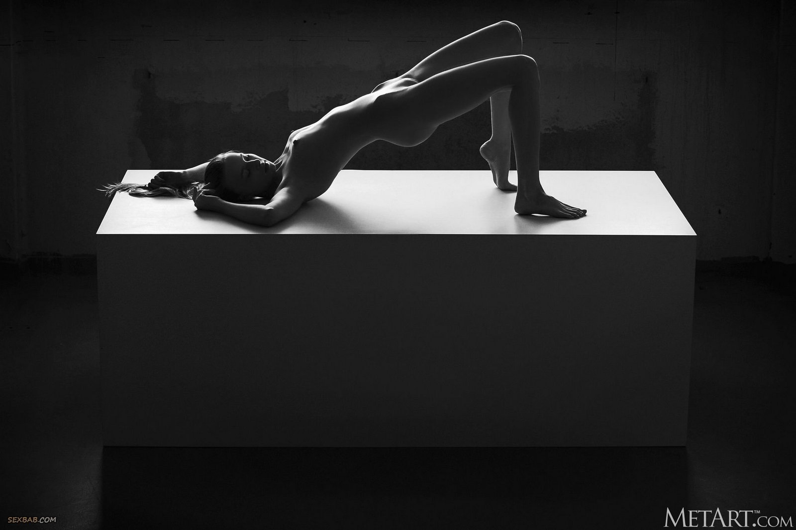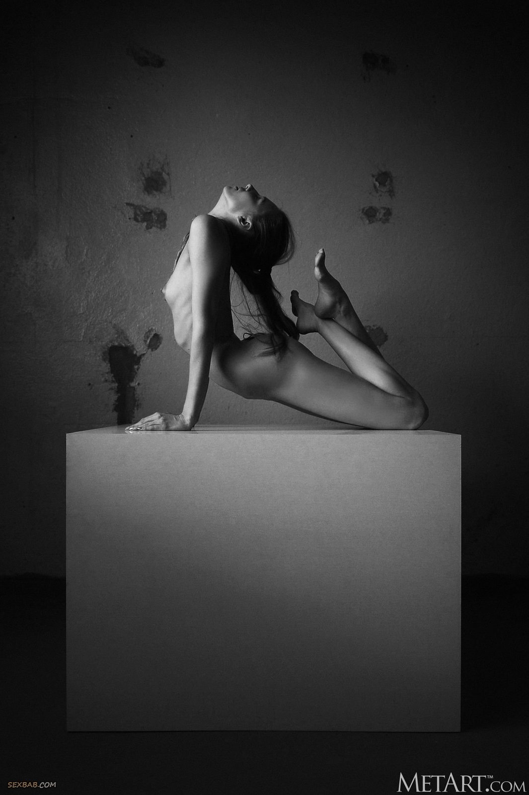 Голая гимнастка извивается всем телом на кубе