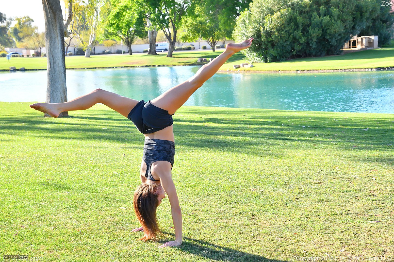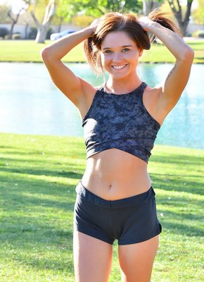 Описание: Низенькая спортсменка с милой улыбкой, надев короткие облегающие шортики и топик принимается эротично позировать в парке, чередуя разные позиции на газоне. В процессе молоденькая крошка особенно долго акцентировала внимание на подкаченных ягодицах, для этого максимально грациозно прогибаясь раком.