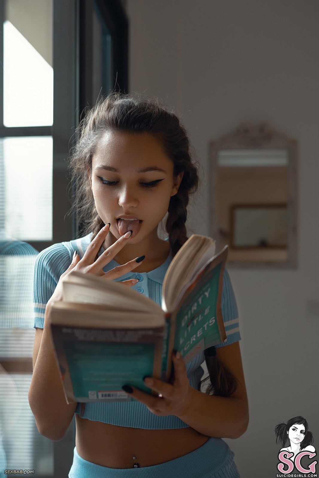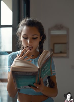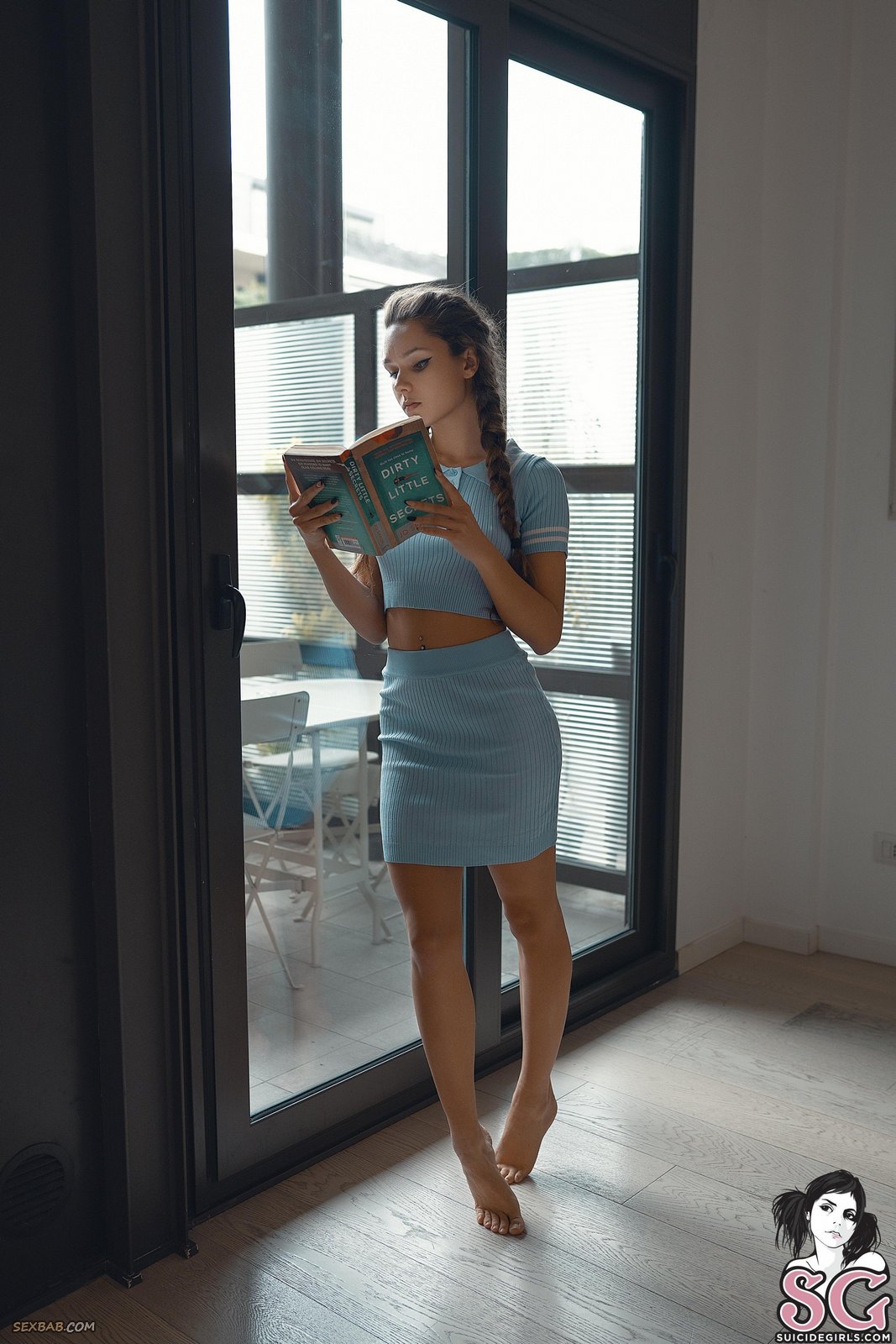 Описание: Увлеченно читая эротический роман и постепенно возбуждаюсь от неприличного содержания, молодая игривая куколка в короткой юбке без трусиков чувственно извивается перед нами на полу в разных позах и мельком показала нам между раздвинутых ножек свою голую бритую киску.