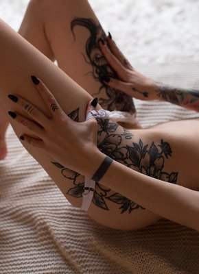 Девка с татуировками в белом нижнем белье