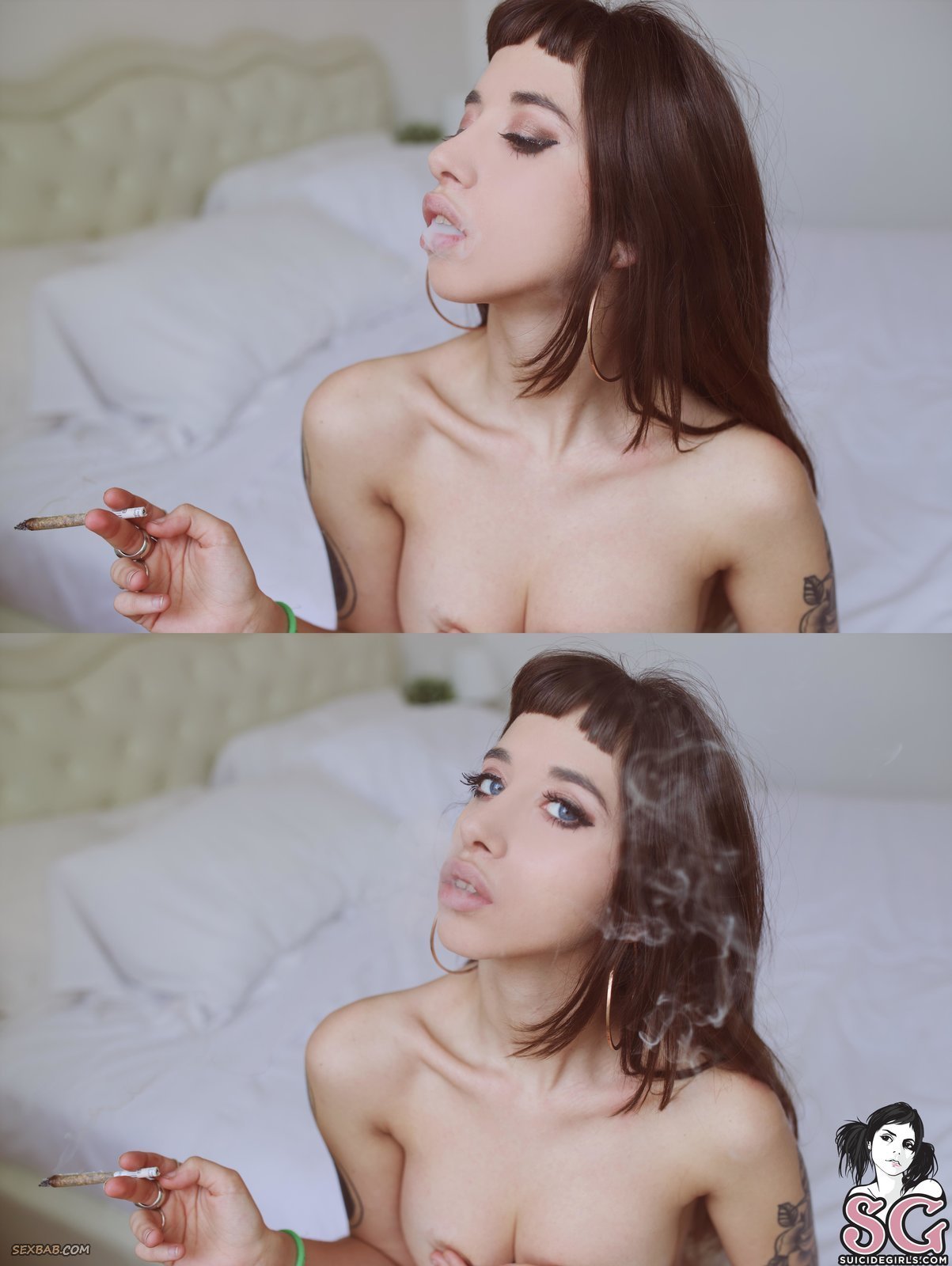 Описание: Покуривая сигарету и кувыркаясь перед фотографом на кровати, красивая растаманка с татуировками и пухлыми губами медленно раздевается и вскоре оказывается абсолютно голой. Стянув с себя трусики, сексуальная шалунья хвастается аппетитной задницей с упругими ягодицами и натуральными буферами которые так и хочется сжать в своих руках.