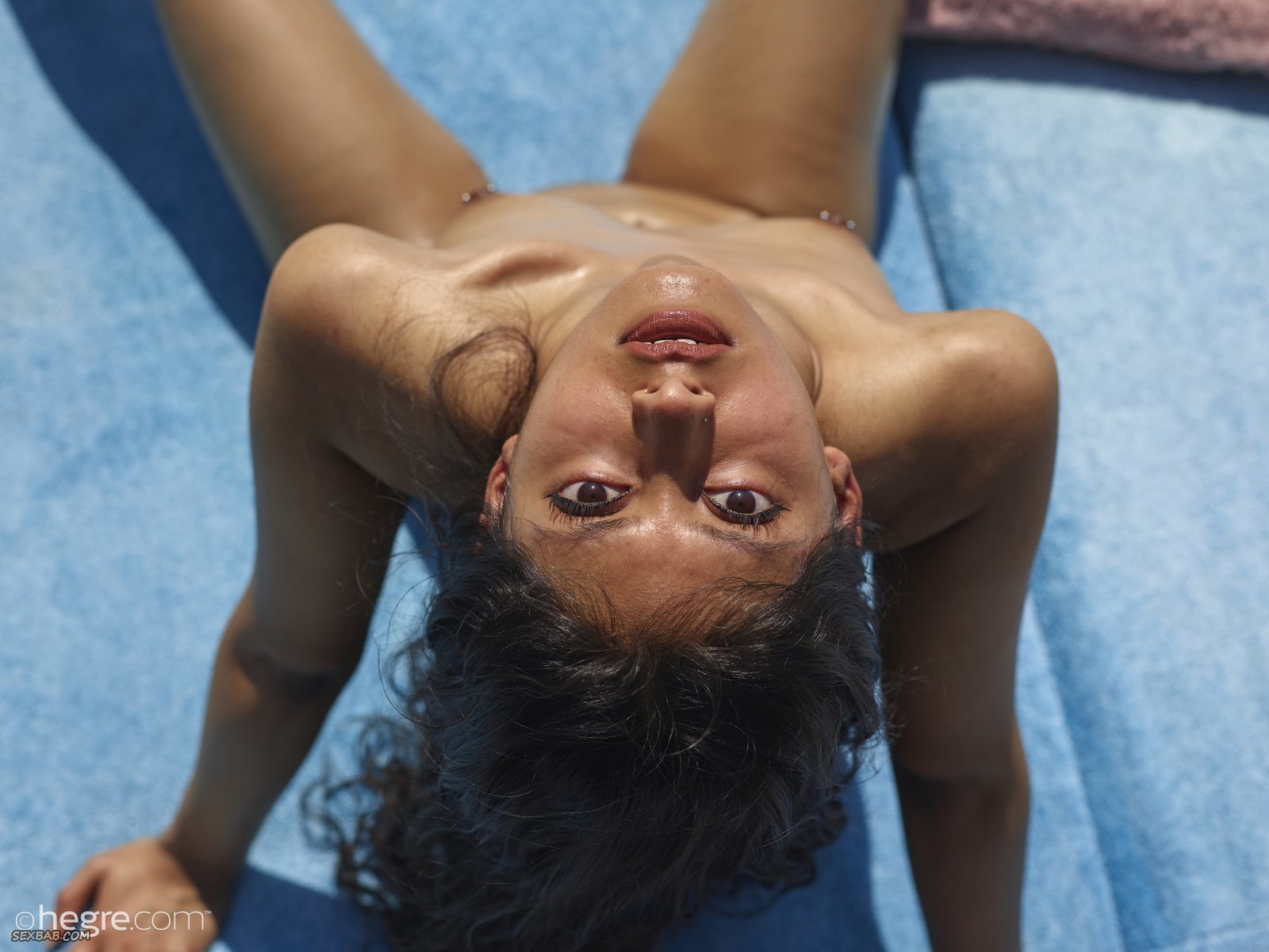 Описание: Экзотической внешности тощая брюнетка голой загарает на заднем дворе своего дома. Девушка намазалась каким-то маслом, от чего её худенькое тело буквально светится в лучах солнца. А принимая откровенные позы она позволяет нам насладиться всеми её прелестями, включая маленькие сиськи и бритую письку.
