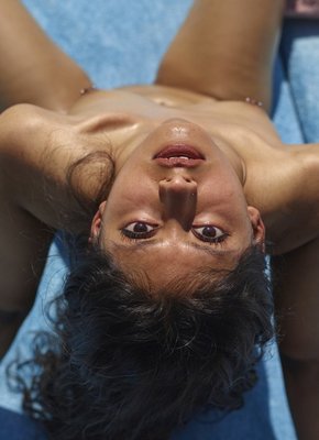Тощая смуглая брюнетка загарает голой
