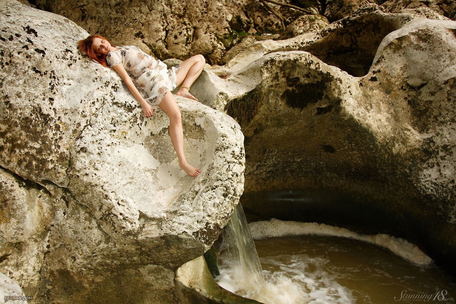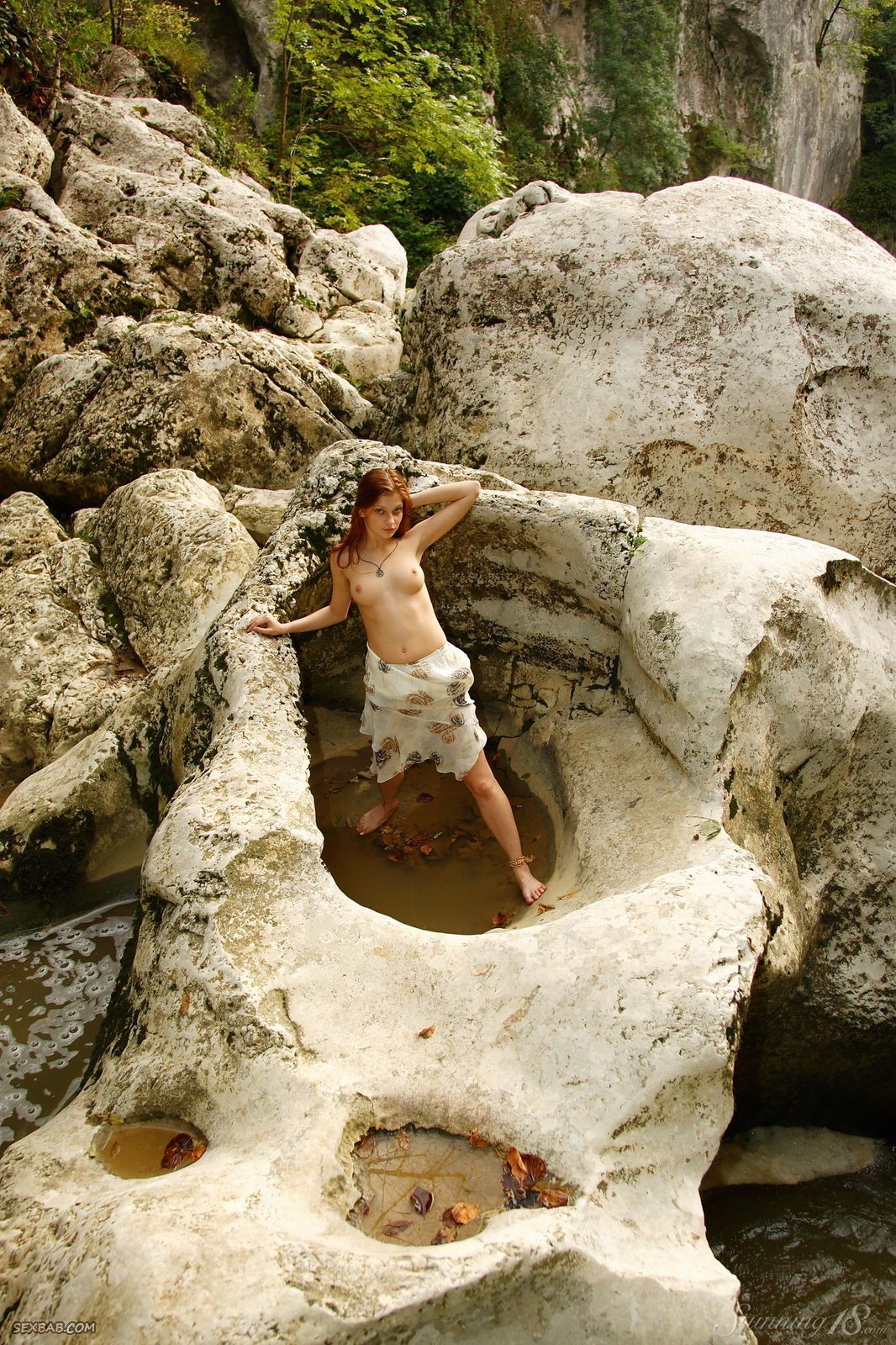 Описание: Выбрав подходящее место на природе и начав эротично позировать на камнях, рыжая девка с худенькой талией параллельно раздевается догола и ощущает возбуждение. Обнаженной сексуальная стройняшка с маленькой грудью лучше всего засвечивает бритую письку с гладким лобком.