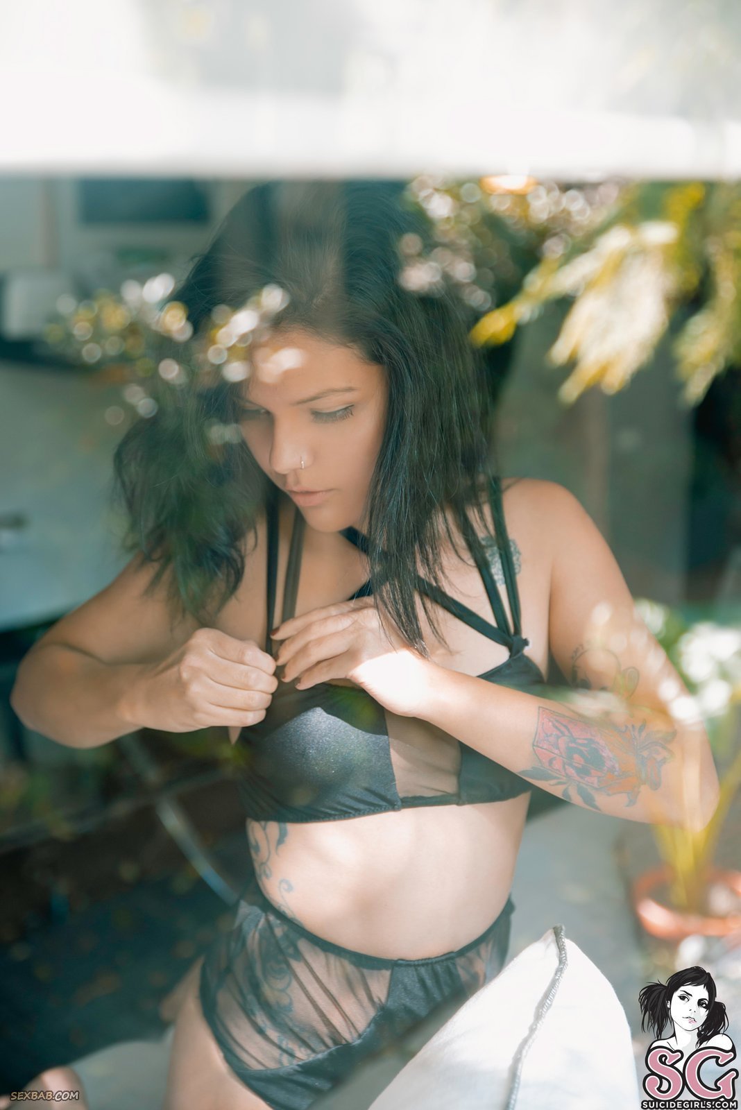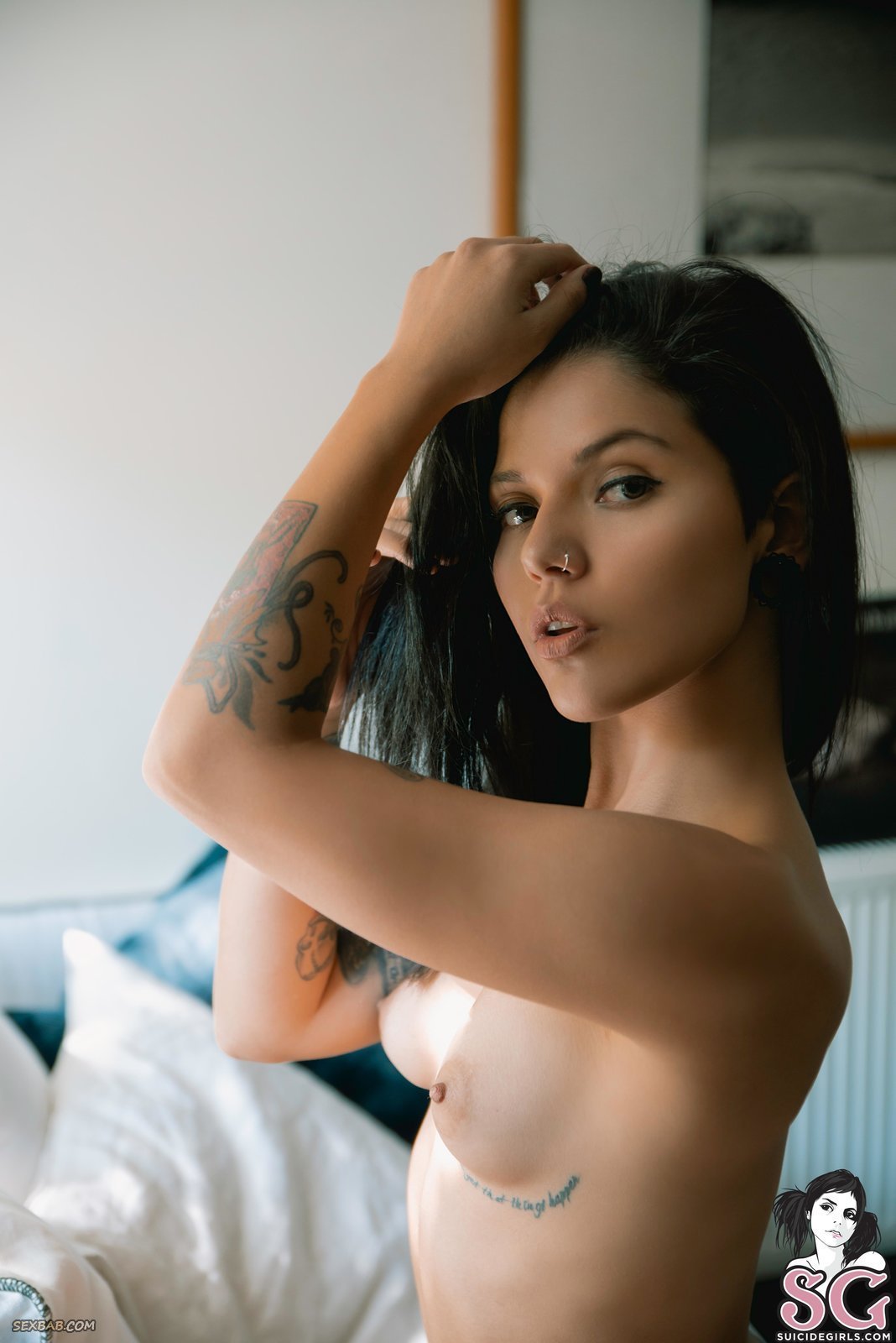 Описание: Эротично позируя перед фотокамерой, позволяя нам понаблюдать за ней с разнообразных ракурсов, сексуальная брюнетка с татушками по всему телу и пирсингом в носу не спеша обнажает свои симпатичные титьки. Красавица кажется очень чувственной и привлекает буквально всем. У неё прекрасный взгляд, сногсшибательное тело и довольно смазливое личико.