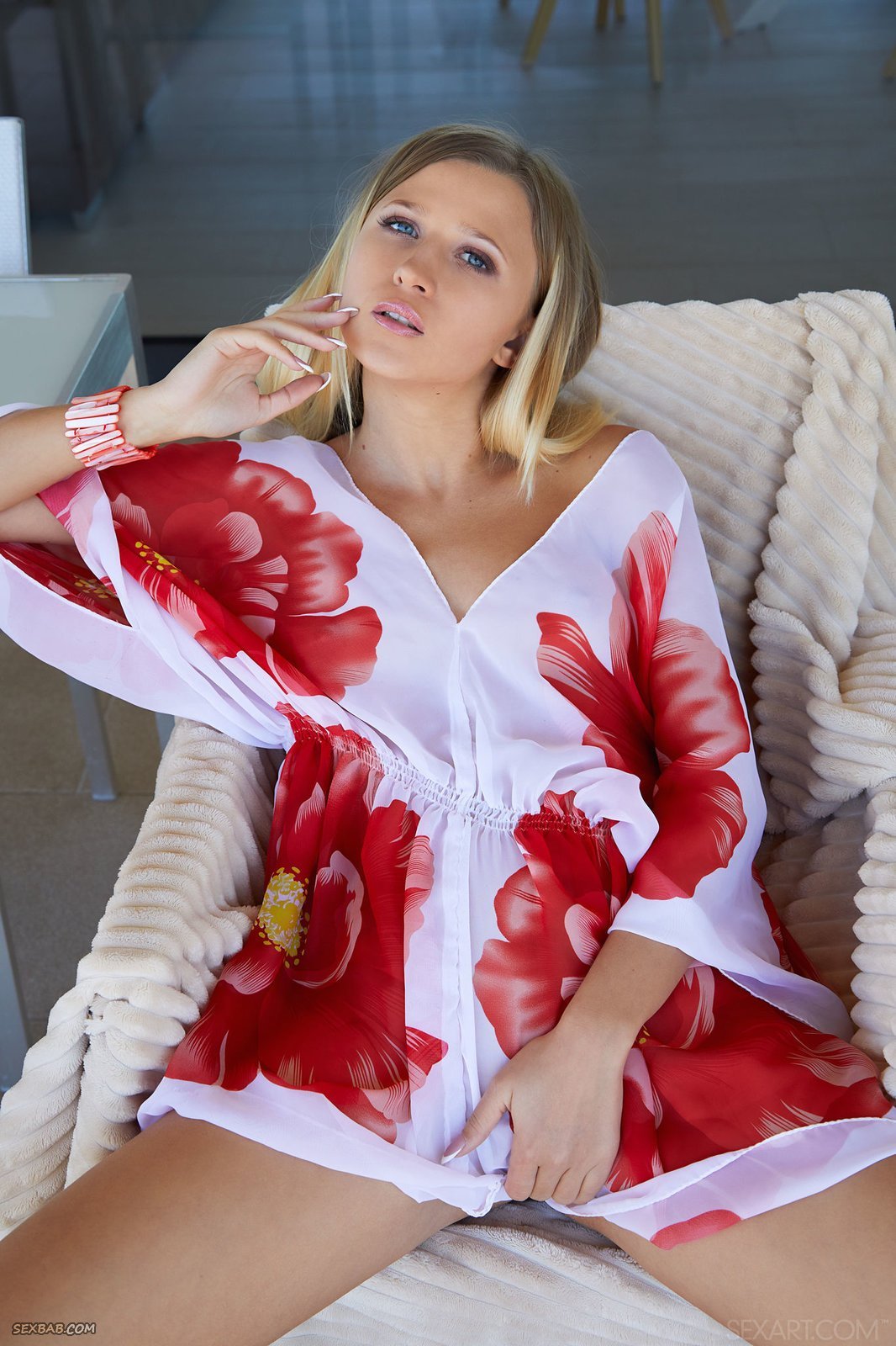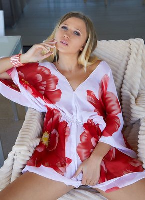 Описание: Очаровательная голубоглазая красотка, обнажённой устроившись на стуле, соблазнительно позирует для нас и скидывает с себя шёлковый халатик. Оставшись же совершенно голой сексуальная дамочка с аккуратными натуральными сиськами присаживается на корточки и широко раскрывает промежность нежно погладивая пальцами бритую письку.