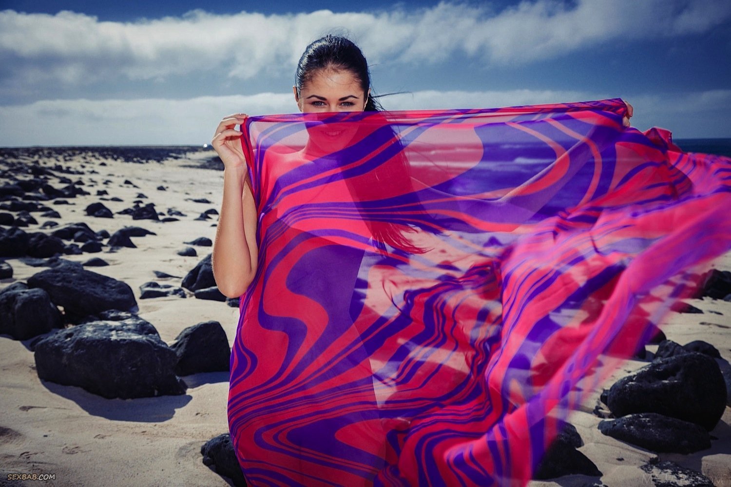 Описание: Прикрываясь парео, игривая и полностью обнаженная брюнетка нежится на пляже, присаживаясь на камень и валяясь на песке. Испытывая от своей наготы сильное возбуждение, стройная красавица с большой радостью демонстрировала маленькие сиськи и гладенькую письку с аккуратной попкой, порой поглаживая лицо руками.