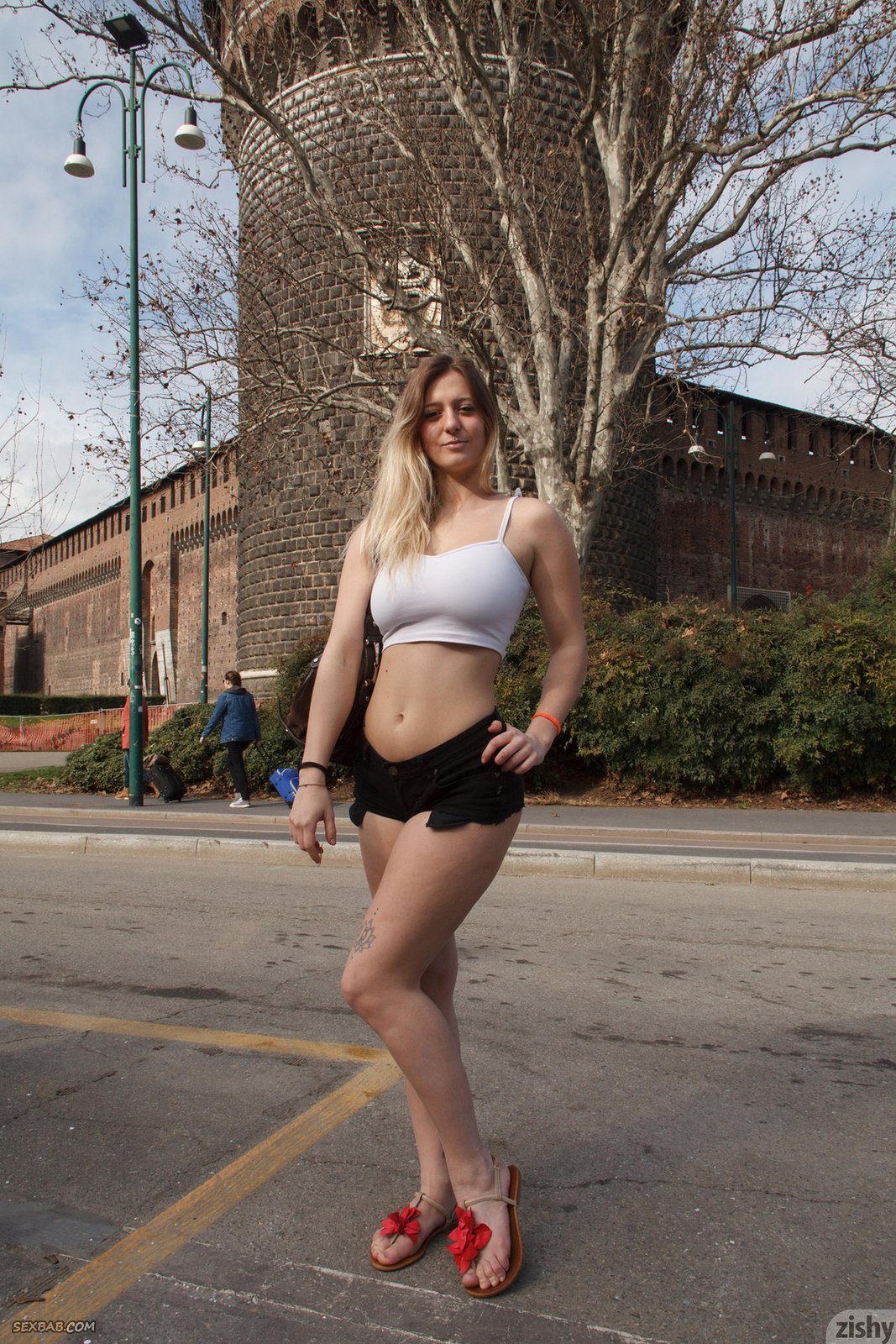 Описание: Симпатичная и весьма сексуальная дамочка с широкими бедрами и крашенными светлыми волосами эротично прогуливается на улице и периодически задирает свою длинную юбку. Поддаваясь своему игривому настроению, модель порой засвечивала натуральные сиськи и бритую письку с пухлыми половыми губками.