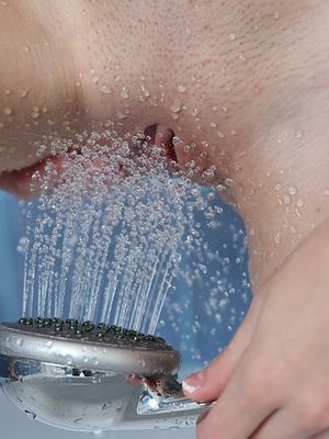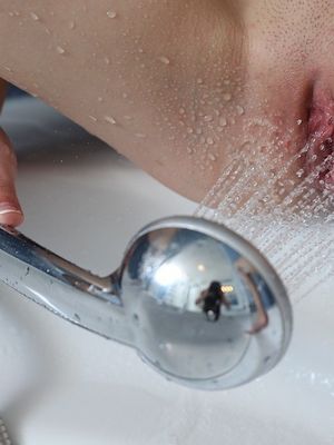 Голая худенькая брюнетка с милым личиком моет писю в ванной